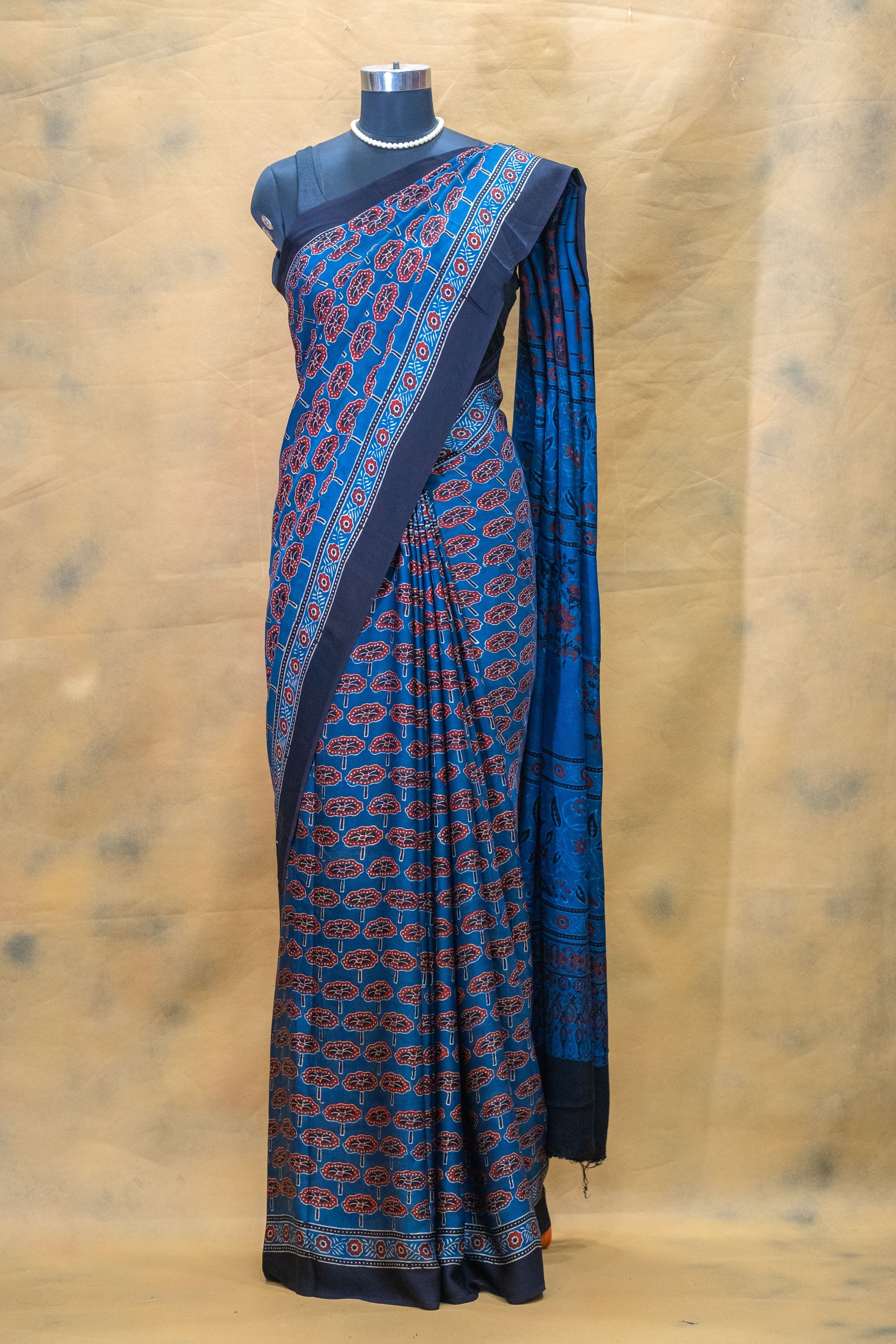 Elevate your ethnic wardrobe with our Dark Blue Floral Modal Silk Saree — a harmonious blend of sustainable luxury and timeless style. Crafted from eco-conscious modal fibers blended with silk, this saree offers a smooth, feather-light drape with a lustrous sheen that feels incredibly soft on the skin.