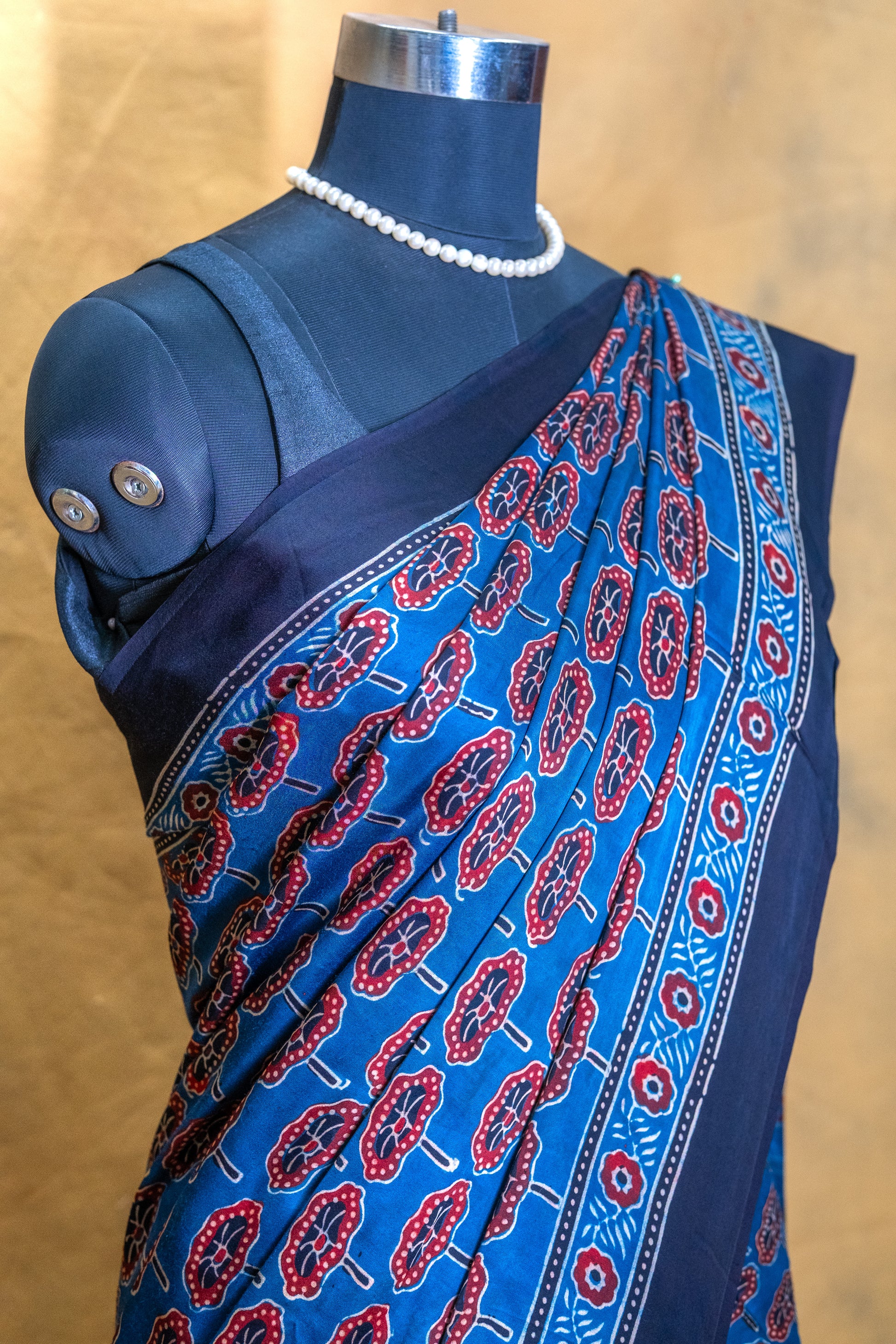 The rich dark blue base paired with delicate floral prints strikes the perfect balance between bold elegance and subtle femininity. Whether you’re heading to a formal lunch, a cultural gathering, or an evening soiree, this saree brings modern grace to every occasion.