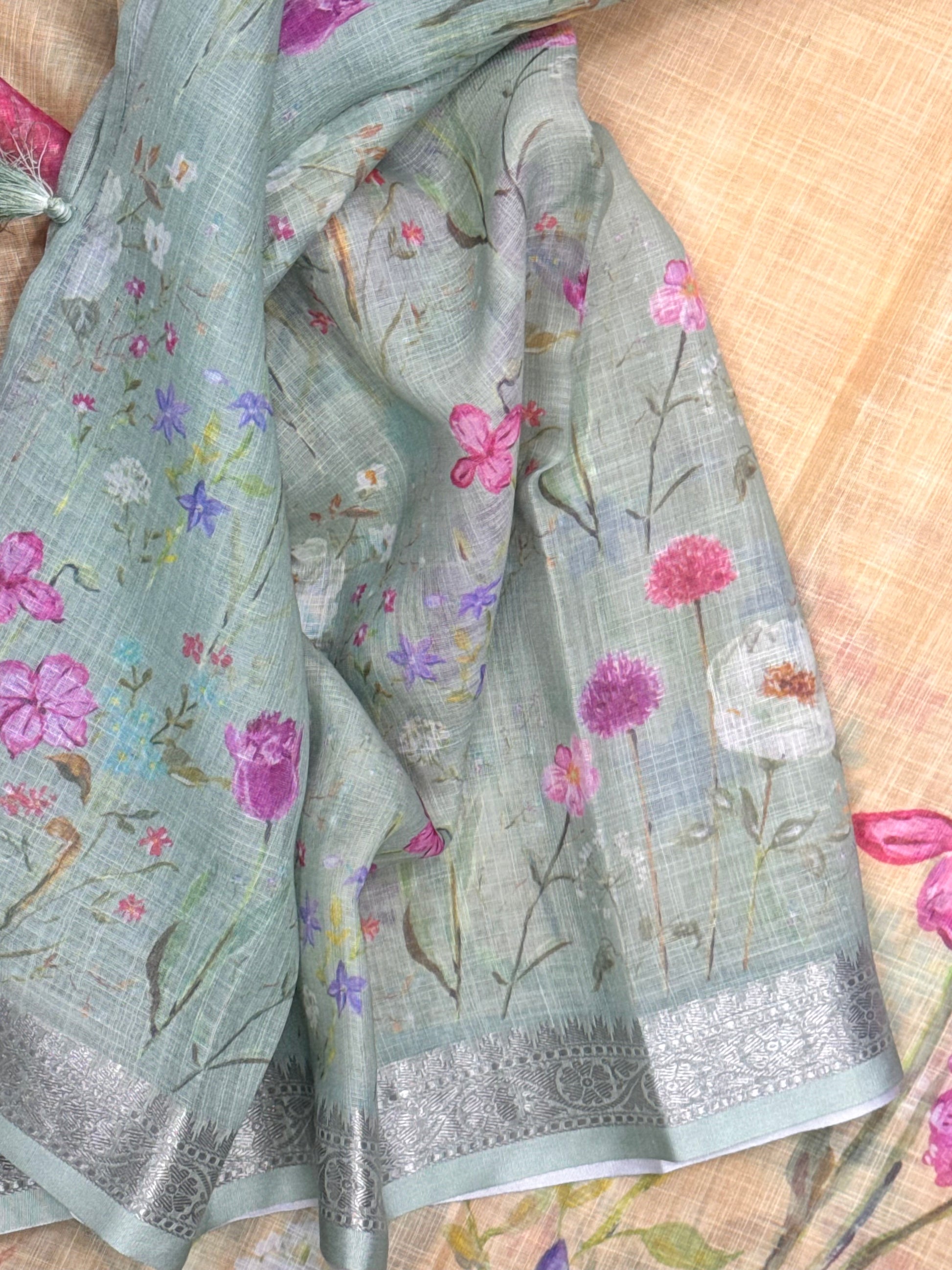 The soft light blue tone evokes calm sophistication, while the floral prints add a touch of playful femininity. Perfect for casual outings, festive brunches, or cultural functions, this saree brings refined beauty to your everyday ethnic wardrobe.